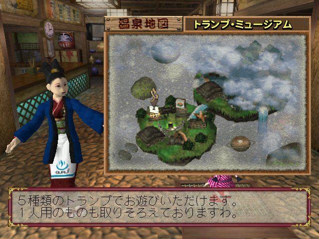 From what I can tell, this is the same basic game as Atsumare! GuruGuru Onsen but now compatible with the Dreamcast Broadband adaptor. It appears that the game has the same 3 titles (Mahjong, Shogi and Trump) and still features the 3D presentation and single player modes. It’s a bit tougher to find, as you may imagine.