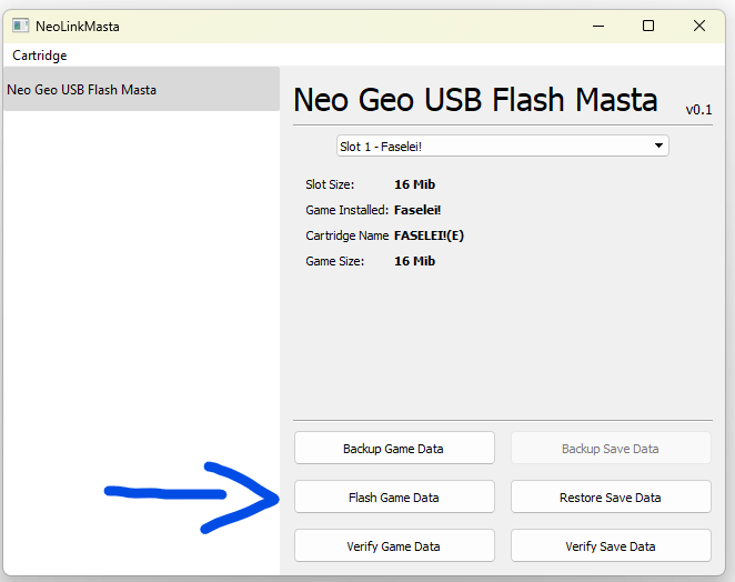 Thing is! roms on the repo are .ngc, and the software expects .ngp, so when from the software of the masta you check your computer to look for the roms, you may just no see them. Just make sure on the options at the bottom of the navigator to select "show all files", not just .ngp.
