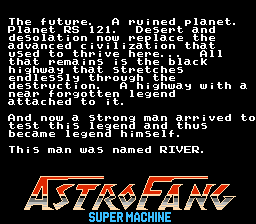 Astro Fang - Super Machine (アストロ・ファング) is a Driving/Racing video game published by A-Wave, Soft Machine released on 1990 for the NES.