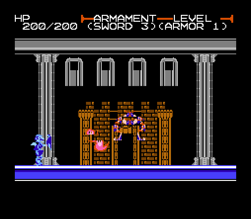 This game is an artistic gem. Family BASIC limits you to specific sprites: Mario, Pauline, Penguin, Fly, etc. This game somehow uses those to create everything from a shielded knight to a flame spewing tektite to a gowned lady – all 2-3x taller than normal sprites. You are usually limited to a single background in Family BASIC. Fisraduth uses darkness to hide portions of the background to give you the feeling of multiple rooms. There are even hidden, secret rooms. It does have its flaws and it's very difficult.
