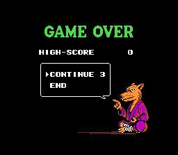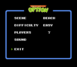 Allow players easy access to the hidden game options menu by pushing RIGHT+START or LEFT+START on the start screen and modify the palettes of Shredder, Super Shredder, and Master Splinter to better match the the classic cartoon and beat-em-ups.