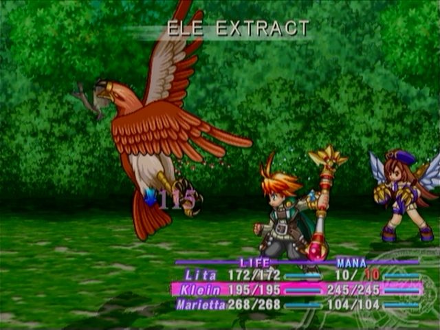This game’s alchemy system is very simple in practice. You extract elements from the surroundings and/or enemies using Klein’s magic staff and have Mana assist you in synthesizing Mana Items out of the elements. These Mana Items are the usual alchemy fare: Healing items, Attack items, etc. Consumables that you can recreate with ease and what you will be using alot with Klein.
