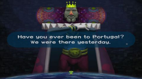 Katamari Damacy is a very unique 3rd-person Puzzle-Action game. Certainly, it can very much be considered a “Widget” game, as in a “Weird Japanese thing”. An offbeat, usually not mainstream production from Japan. In Katamari Damacy (which means “Clump/Clod Soul” in Japanese) you play as the Prince (The little green guy), the son of the King of All Cosmos (The fabulous fellow in the second picture), who in a drunken stupor, destroys every star in the galaxy. It’s now your job to fix his problem.