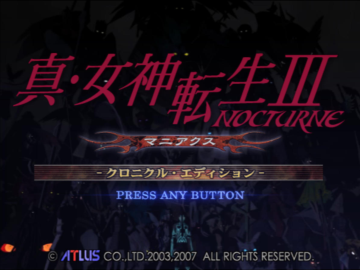 Shin Megami Tensei III: Nocturne Maniax Chronicle Edition (真・女神転生III-NOCTURNE マニアクス クロニクル・エディション) is a RPG video game published by Atlus released on October 23rd, 2008 for the PlayStation 2.