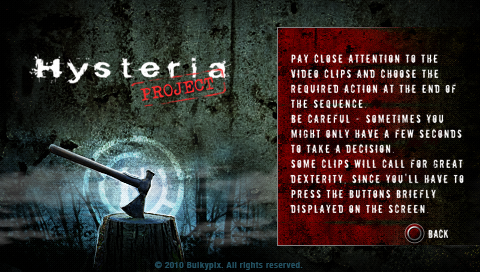 Hysteria Project is a Action-Adventure/Survival Horror video game published by Sanuk Games released on April 15th, 2010 for the PlayStation Portable.