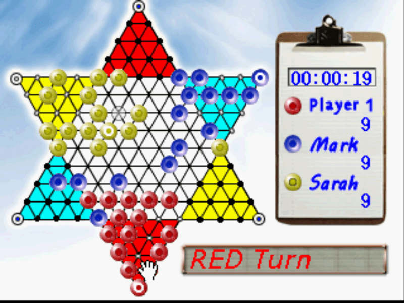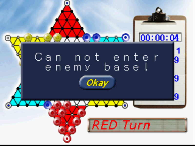 A puzzle game known as "Chinese Checkers" in America. The goal is to move all your pieces to the area on the opposite point of the star. This area is marked on the board with the same color of your own pieces. You can jump over opponent's pieces just like in checkers but they are not removed from the board. The first team to move all pieces wins. 1-2 players game.