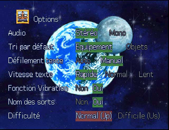 Besides French translation the patch also undub (brings back Japanese voices), and restores original difficulty of the Japanese version that was increased by Working Designs if you select it from the options menu: