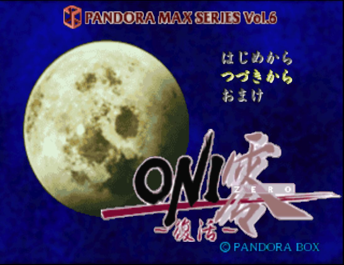 Pandora Max Series Vol. 6: Oni Zero: Fukkatsu (パンドラMAXシリーズ Vol.6 ONI零 ~復活~) is a RPG video game published by Pandora Box released on March 22nd, 2001 for the PlayStation.