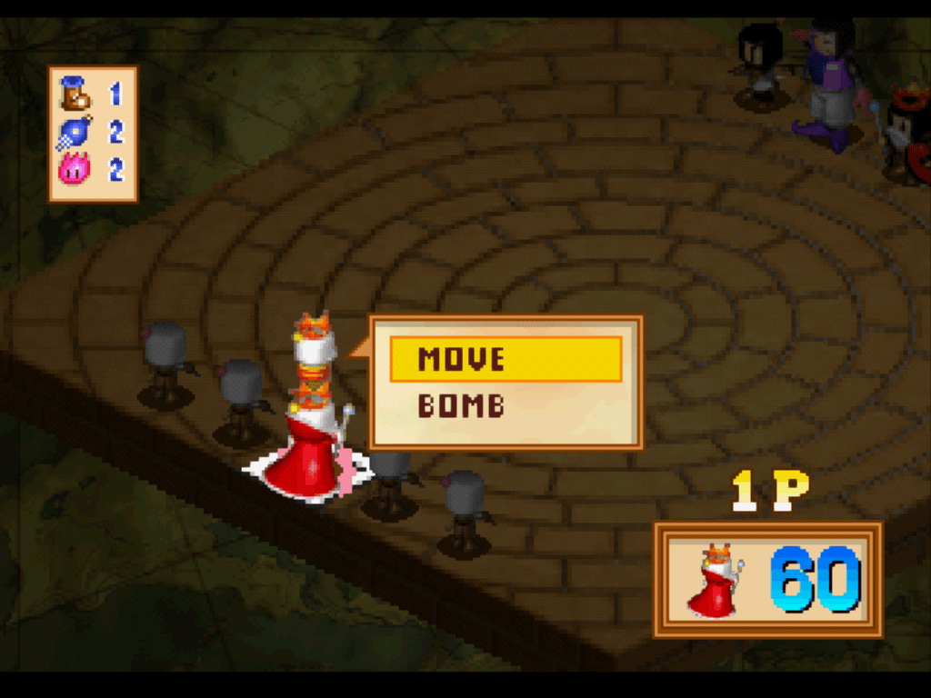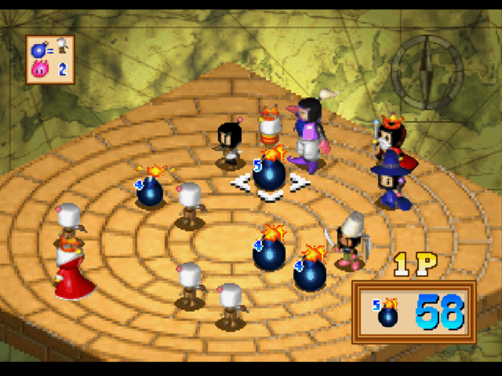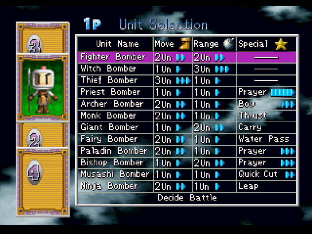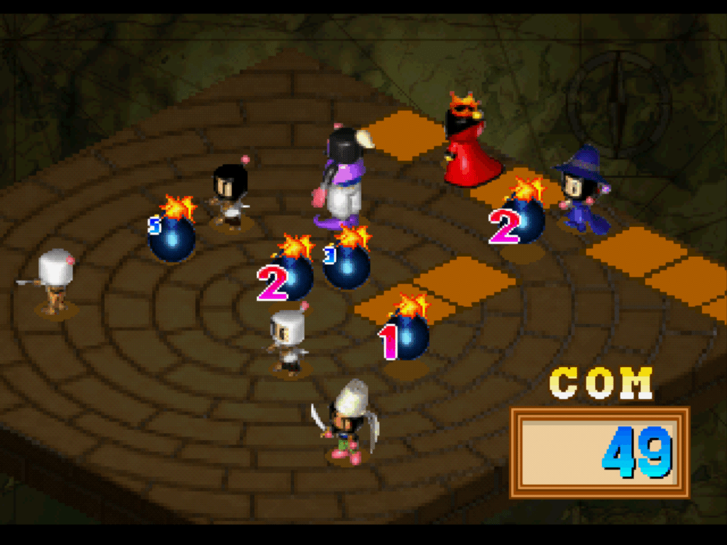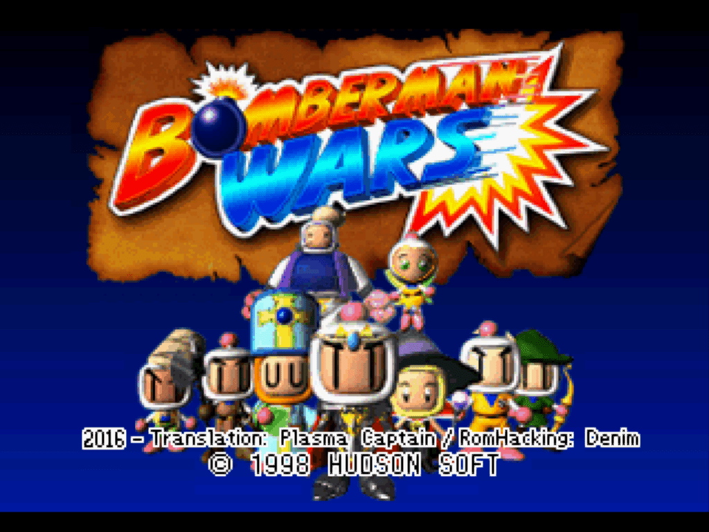 In 2009, Plasma Captain translated some text from Bomberman Wars and posted it at Bomberman Board. As they lacked the romhacking skills, they hoped for someone able to do the hack in PSX. Some few years later, I was willing to try translating a PSX game so I could study some ASM in R3000. I chose Bomberman Wars because it is a game that I played a lot in the past and it is very fun. As I don't know Japanese, I searched for a translation over internet. Luckily I found Plasma's text. ~ DenimBomberman Wars is a turn-based strategy game. Each player controls a set of Bombermen, moving them around the board and placing bombs to trap and blow each other up. There's really nothing quite like it, and unfortunately, the game was never released outside of Japan. I imagine that a lot of people who don't know any Japanese were afraid to try it because it is menu-based. Thanks to Denim, with this patch, Bomberman Wars is a lot more approachable to us foreigners. ~ Plasma Captain