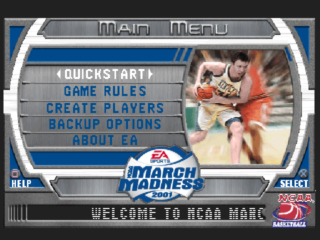 NCAA March Madness 2001 is a Basketball video game published by EA Sports released on December 6th, 2000 for the Sony PlayStation (PSX).