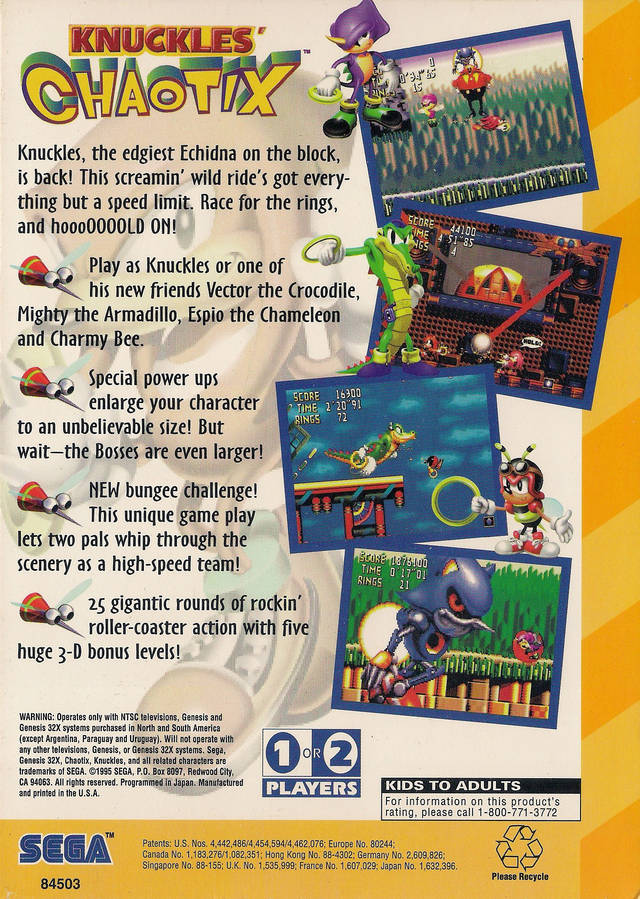 Knuckles' Chaotix is a Platformer 2D video game published by SEGA, Sonic Team released on April 20th, 1995 for the SEGA 32x.