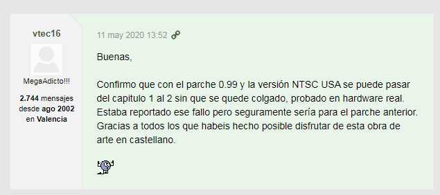 Basado en La version NTSC de redump. El parche traduce y quita censura. En romhacking esta escrito lo siguiente "Freezing at the beginning of act 2 in NTSC version." Pero por lo que leí eso se refiere a una versión anterior del parche que usaba un parcheador java (.jar). Esta versión no usa eso. Y acá esta la confirmación: