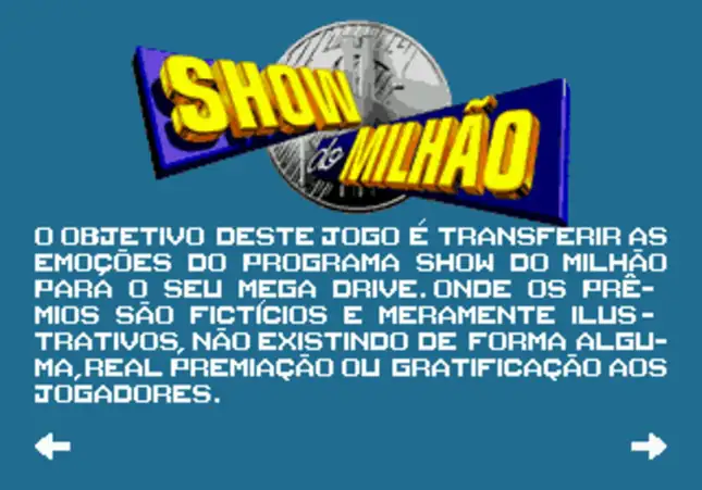 Show do Milhão is a Game Show/Trivia video game published by Tectoy released on 2001 for the SEGA Genesis.