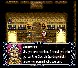Arabian Nights: Sabaku no Seirei Ou (アラビアンナイト砂漠の精霊王) is a RPG video game published by Pandora Box, Takara released on June 14th, 1996 for the SNES.