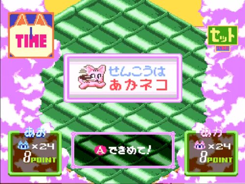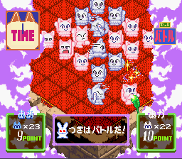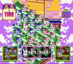 Asameshimae Nyanko (あさめしまえにゃんこ) is a Board Game/Strategy video game published by J-Force, Zamuse released on March 18th, 1994 for the SNES.