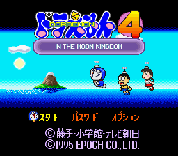 Doraemon 4: Nobita to Tsuki no Oukoku (ドラえもん4 のび太と月の王国) is a Action video game published by Epoch released on December 15th, 1995 for the SNES.