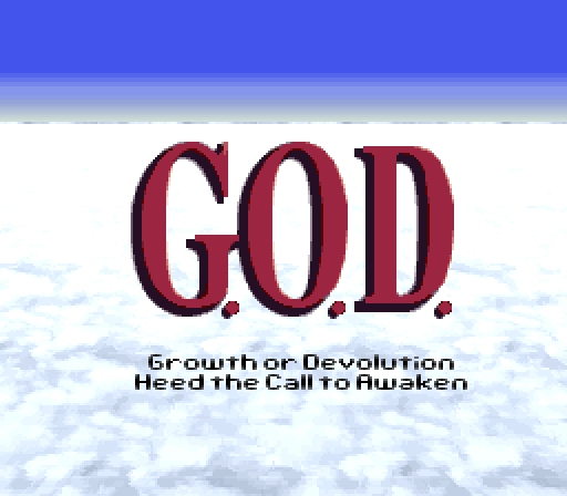 G.O.D: Mezame yo to Yobu Koe ga Kikoe (G.O.D 目覚めよと呼ぶ声が聞こえ) is a RPG video game published by Imagineer released on December 20th, 1996 for the SNES.