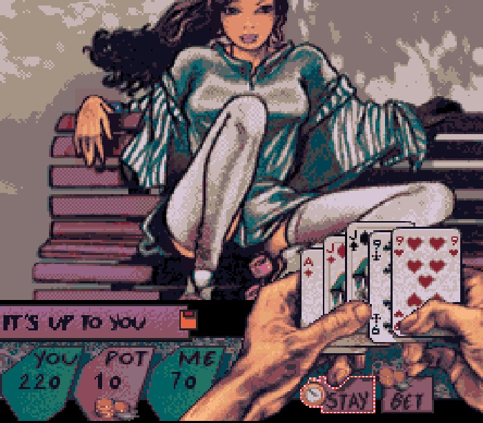 This is an unofficial conversion of 1988's Amiga version of the strip poker game Teenage Queen, released for the SNES, for free, via https://www.portabledev.com/jeux/supernes/teenage-queen/. Be sure to check out their original post, so you can get much more details and follow updated versions, okay? If you enjoy it, please, consider to follow the author's pages and to support their projects! You can send donations or comment there to let them know their work reached you.